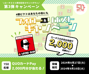 ロータスクラブ公式X(旧Twitter)アカウント(@LOTAS_CLUB)をフォローし、同アカウントから投稿された「#ロータス50周年記念カウントダウン」のハッシュタグが付いた投稿をリポストすると、抽選で150名様に、2,000円分のQUOカードPayが当たります。